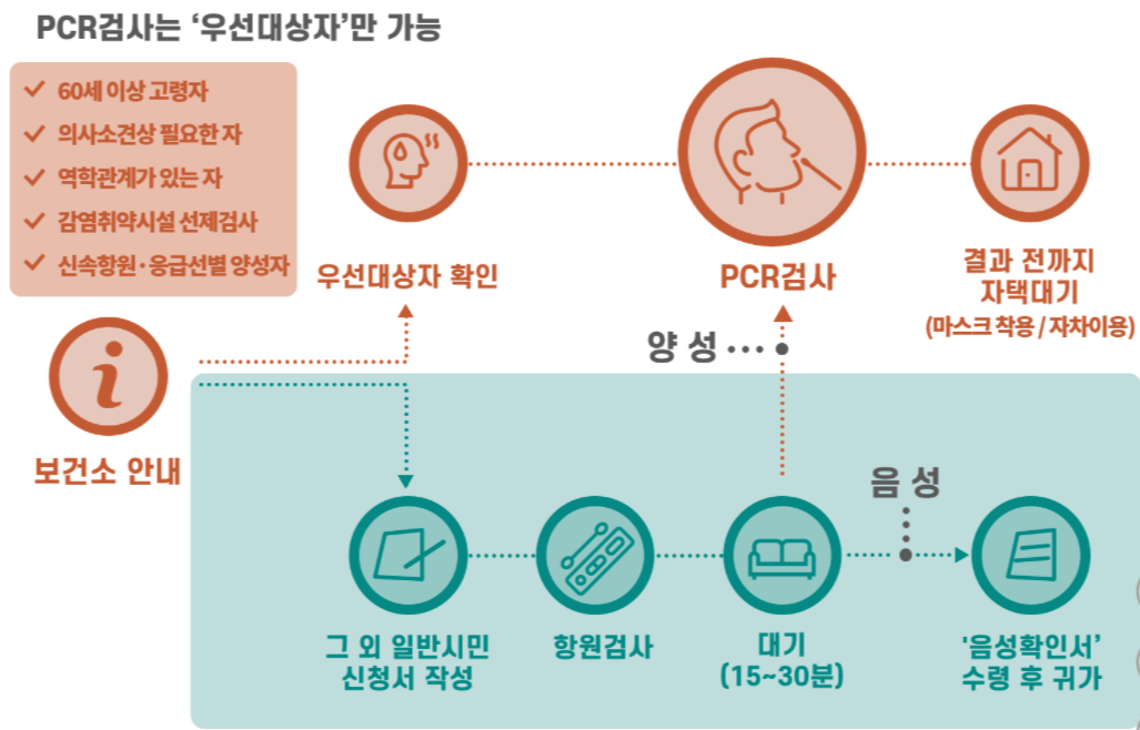| PCR 검사 우선 대상자 | 역학 연관자, 의사 유소견자, 60세 이상, 자가검사키트 양성, 전문가용 신속 항원 양성, 요양병원 등 고위험군에 속하는 분 |